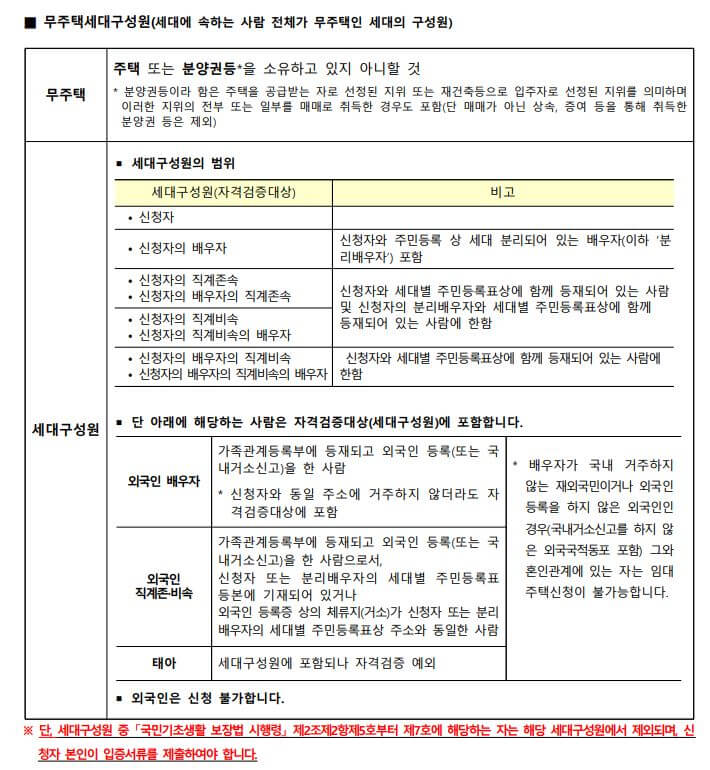 그리고 그 세대 구성원은 신청자의 배우자가 포함됩니다. 신청자와 주민등록 상에 세대분리가 되어있더라도 배우자가 포함됩니다.