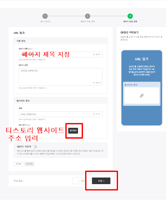 4단계 : 다음으로 '페이지 제목'을 지정해 주고 '티스토리 웹사이트 주소'를 입력 후 '링크 첨부'를 클릭해 줍니다. 그리고 '다음' 버튼을 눌러줍니다. 여기서 페이지 제목은 크게 중요한 게 아니니 적당한 단어를 입력해 주시면 됩니다.