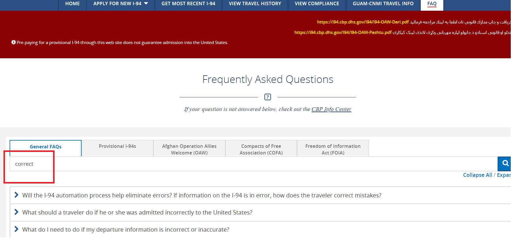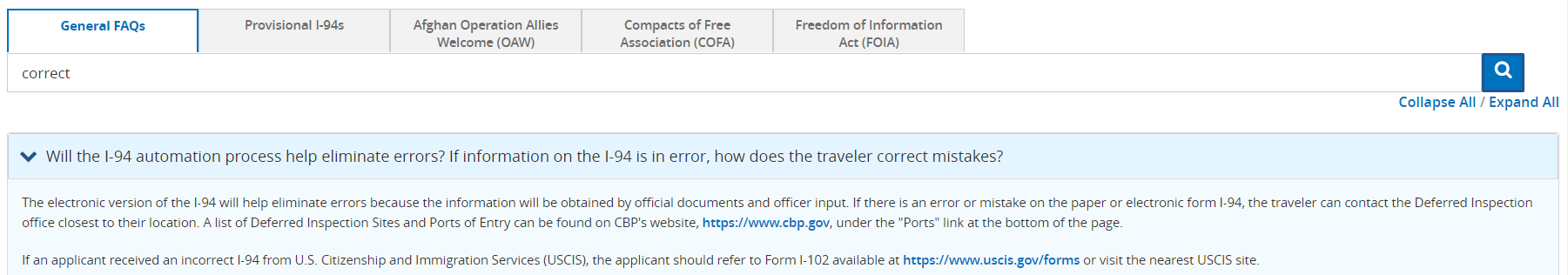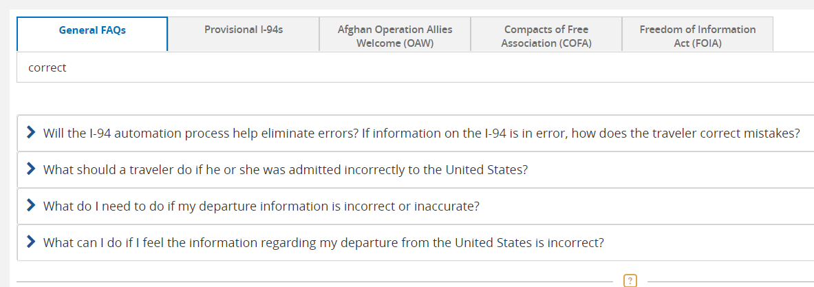 1-3. 검색을 하면 아래와 같이 4가지 질문과 답변이 나옵니다. 거기서 첫 번째 "Will the I-94 automatio process help eliminate errors? If information on the I-94 is in error, how does the traveler correct mistakes?"의 질문과 답변을 확인하면 됩니다.
