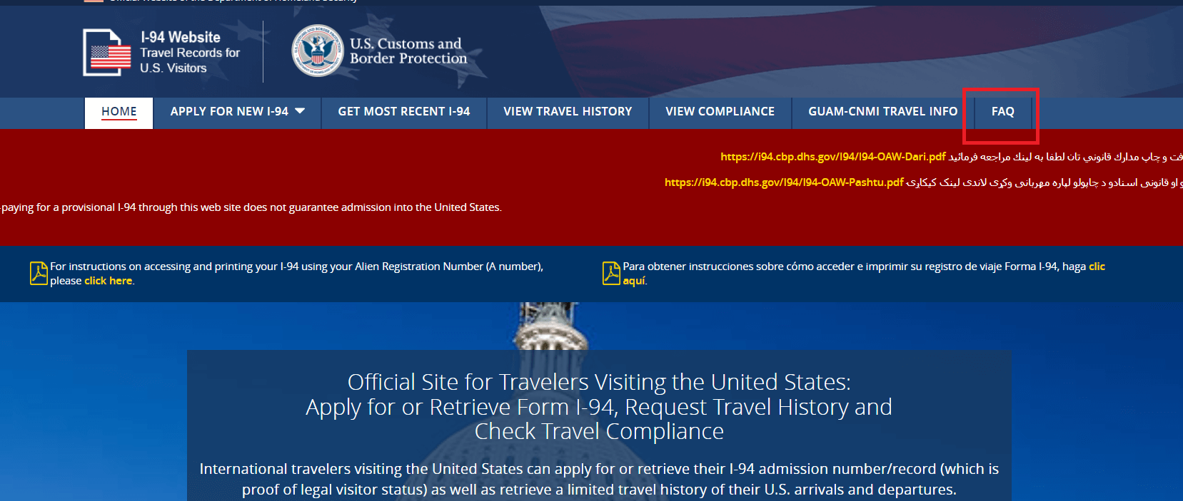 1-1. I94사이트의 우측에 있는 "FAQ"를 선택합니다.